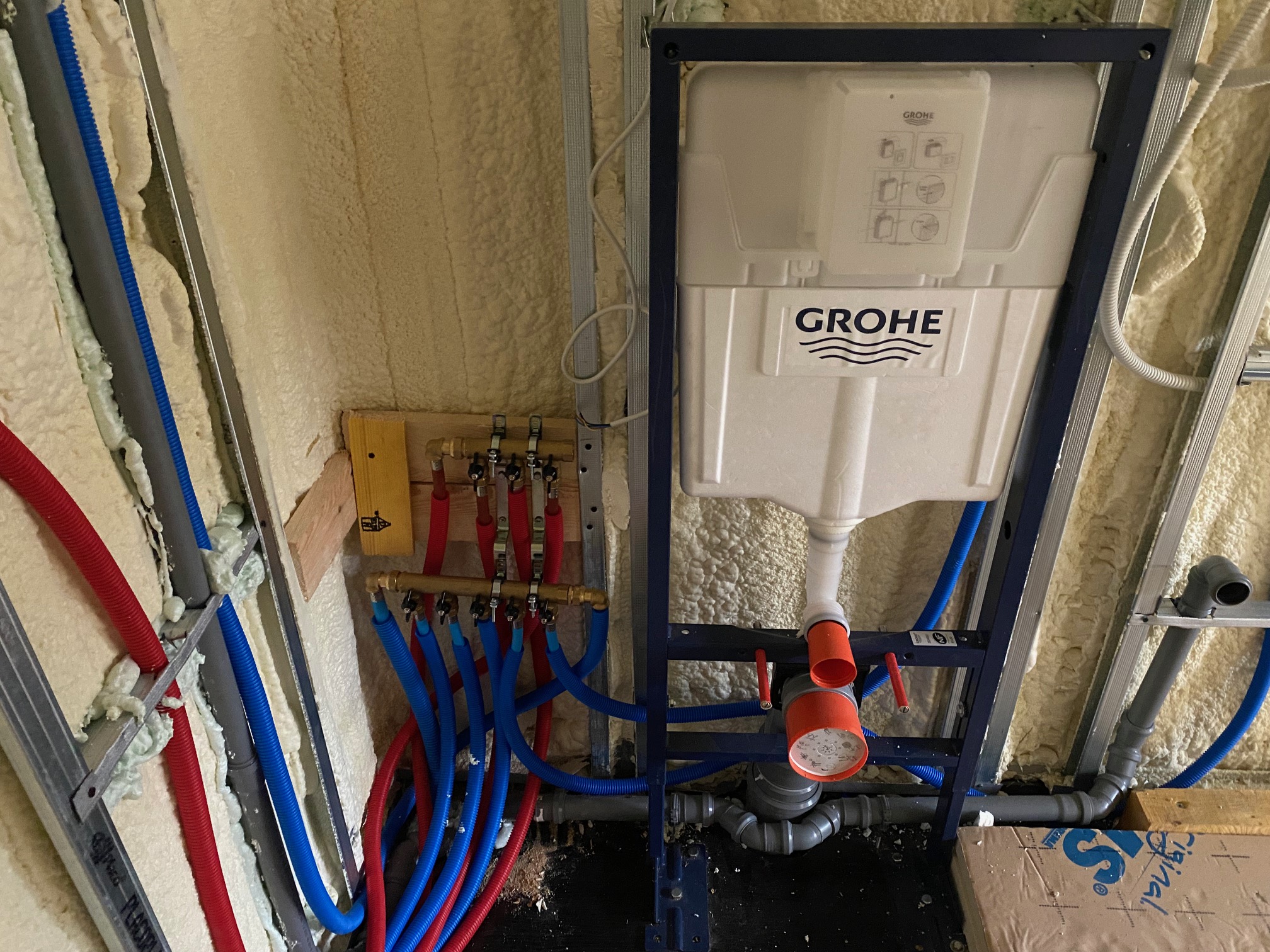Mise en place des gaines électriques, du réseau sanitaire et du système de chauffage.